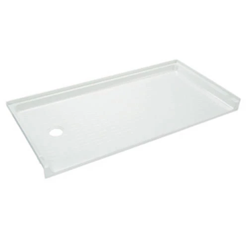 The 30″ Deep x 60″ Wide Single Threshold Shower Floor in White is made of durable molded fiberglass material to directly replace a bathtub and offers a left-hand drain opening that is offset 15 in. x 8-1/2 in., the same as a bathtub. The shower floor meets ADA specifications 07/01/1997 and can be used with wall materials such as Durawall shower walls (not included).