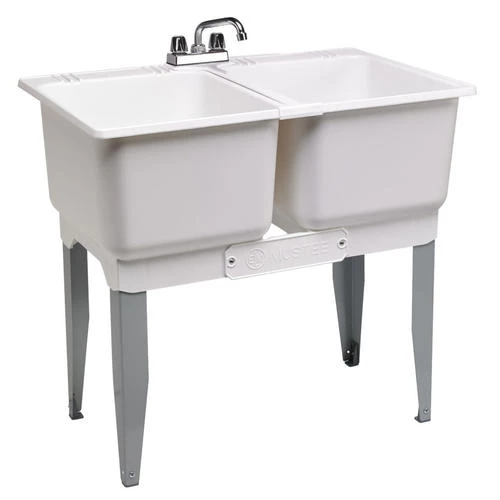 The Mustee® UtilaTwin® Featuring a double 1-piece molded design, the Mustee® 36 in. x 23.5 in. Plastic Laundry Tub features heavy-gauge steel legs with levelers and stoppers for sturdy installation. The 15-gallon capacity tubs have leak-proof, integrated drains and smooth, mildew-resistant surfaces that protect the product and are simple to clean. A ribbed underbody provides added strength and support. These tubs include everything needed for setup and installation.