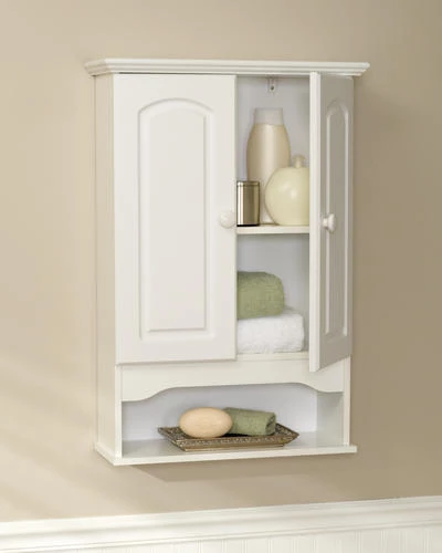 This functional white cabinet adds easy storage for extra towels and bathroom necessities.